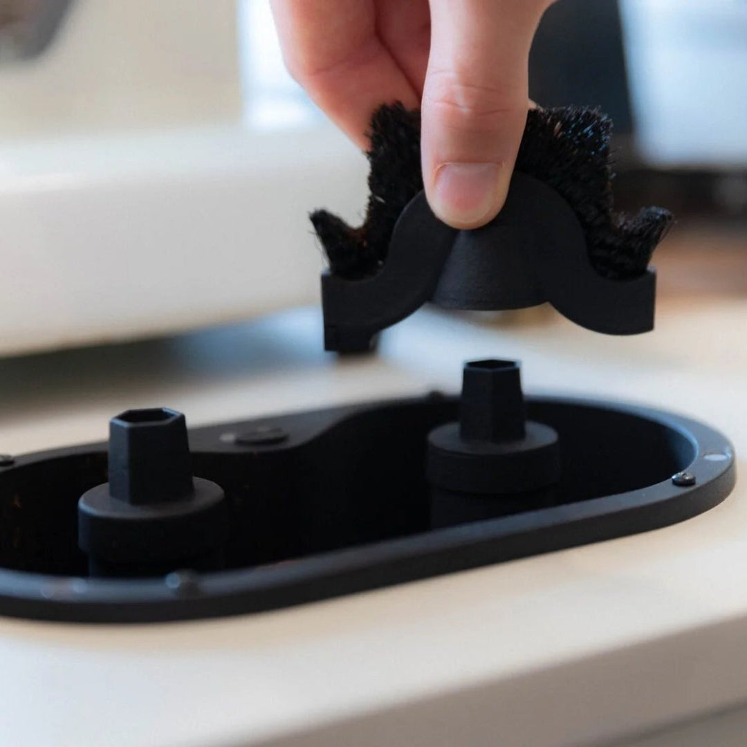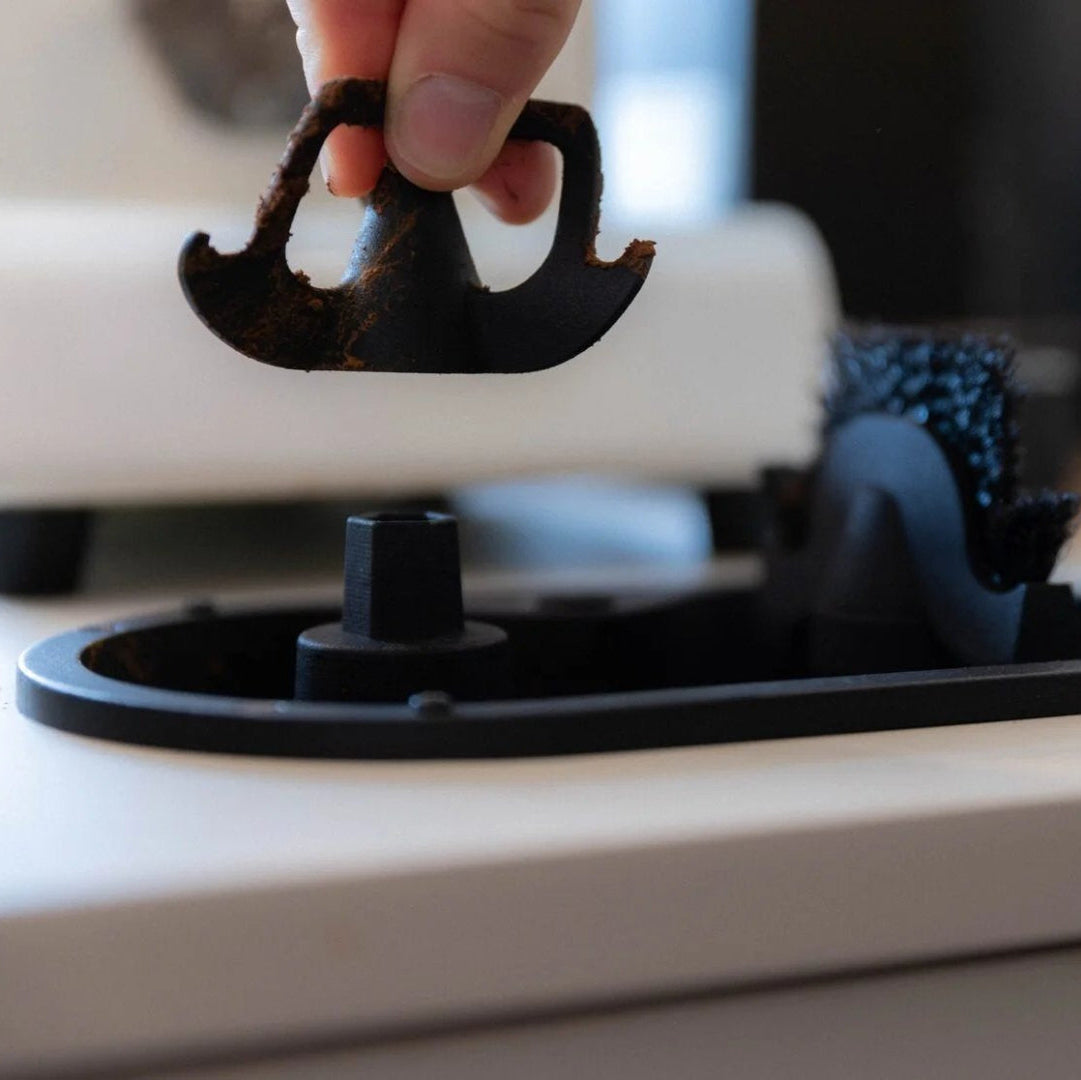 Made of black silicone or plastic, it features a grooved design. It catches coffee grounds and prevents spills, providing a stable “workbench” for cleaning. This keeps coffee residues from soiling the countertop, ensuring a tidy workspace.